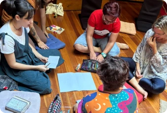 Ali, o ateliê não se organiza como um lugar delimitado entre paredes. Ele pulsa no gesto das professoras, na escolha dos materiais, na forma como o tempo se oferece às crianças e adultos. Está enraizado no corpo de quem habita aquele espaço, não apenas na escola Ayni como no hotel Ayni. Tudo é intencional.